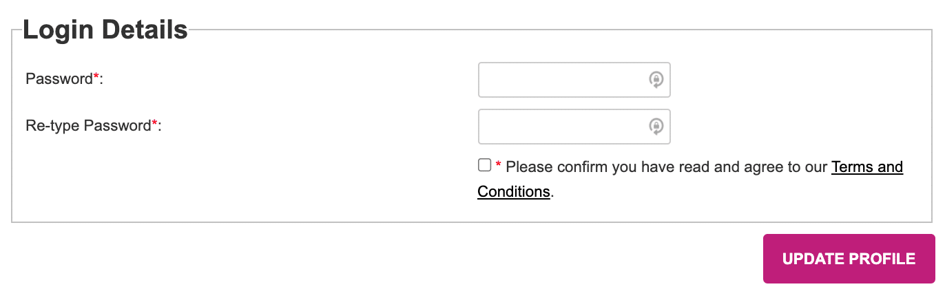 Scroll down until you see the Login Details section, enter the same new password in both fields, tick the box and click the ‘UPDATE PROFILE’ button.